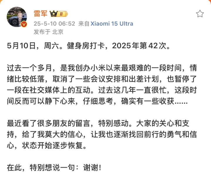 过去一个多月,是我创办小米以来最艰难的一段时间,情绪比较低落,取消了一些会议安排和出差计划,也暂停了一段在社交媒体上的互动。过去这几年一直很忙,这段时间反而可以静下心来,仔细思考,确实有一些收获……