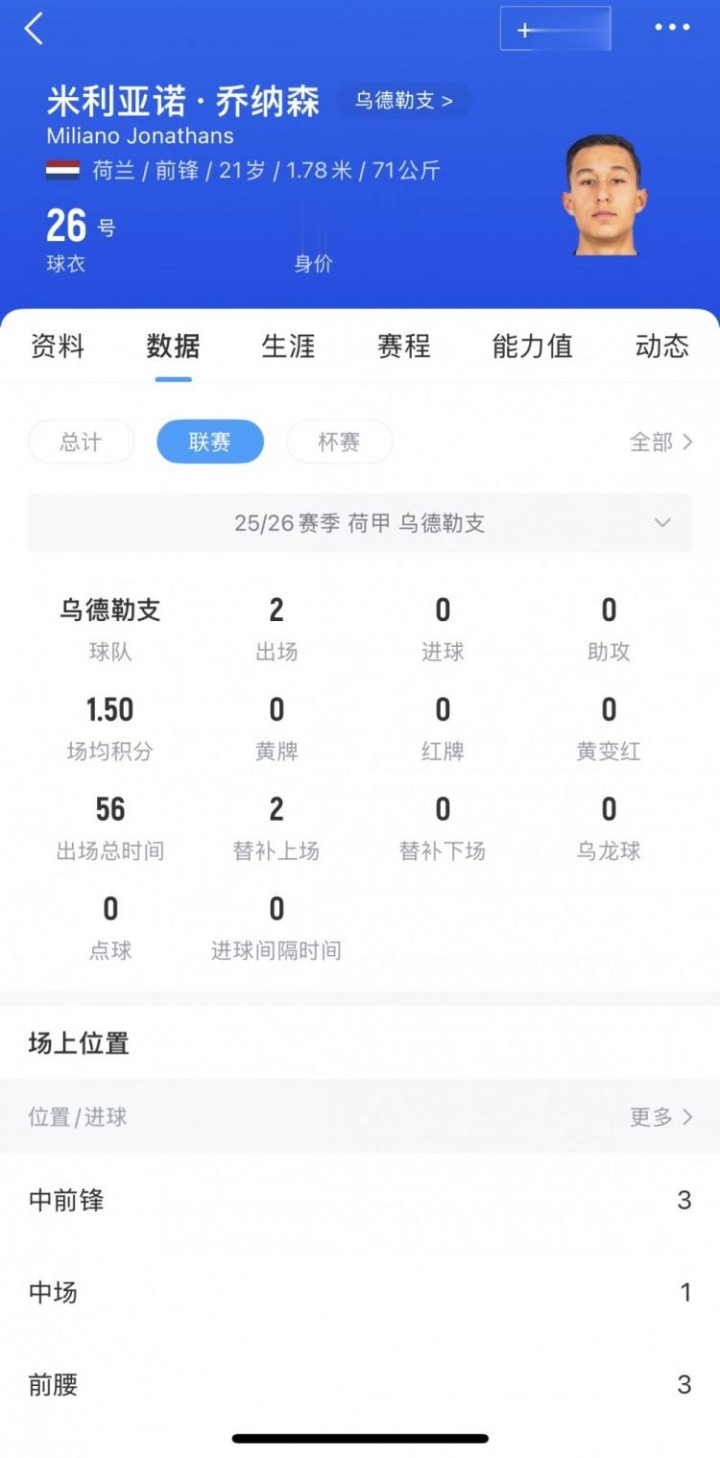 米利亚诺-乔纳森,出道于维特斯青训,今年1月转会到乌德勒支效力,本赛季出战了6场比赛,上赛季他在乌德勒支B队和一线队的31场比赛中打入11球另有4助攻。目前球员德转身价90万欧。